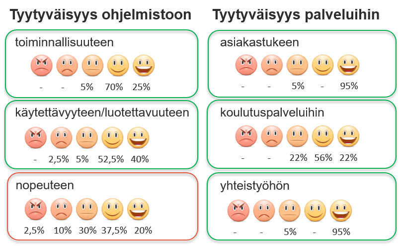 95% vastaajista oli tyytyväisiä ohjelmiston toiminnallisuuteen ja 92,5% sen käytettävyyteen. Asiakastukeen ja CSI-yhteistyöhön oli erittäin tyytyväisiä 95% vastanneista.